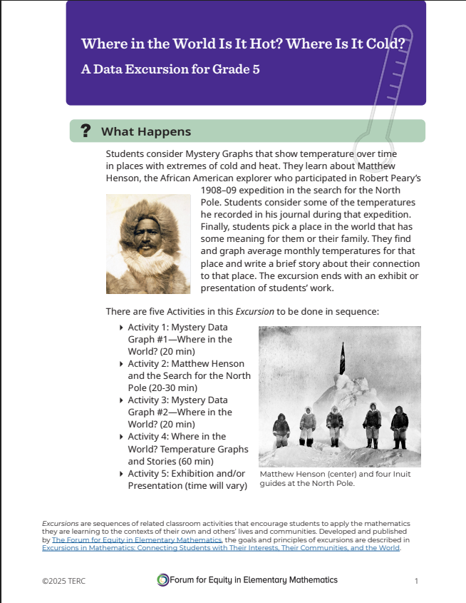 Excursions are sets of related 4-6 activities that encourage students to apply the math they are learning to the contexts of their own and others’ lives and communities. Six Excursions are available for download on the Forum for Equity in Elementary Mathematics. While designed for classrooms using any math curriculum, recommendations for Investigations 3 classrooms are given in the parentheses: